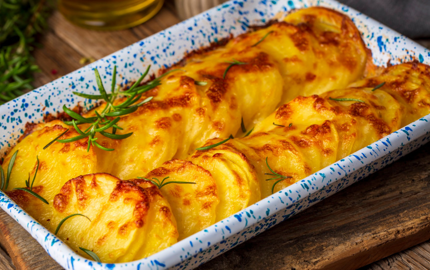 * Į kepimo indą (20 30 cm) sluoksniais dėkite bulves, vis užpilkite grietinėlės, užberkite druskos, pipirų ir po truputį sviesto bei sutrinto česnako.