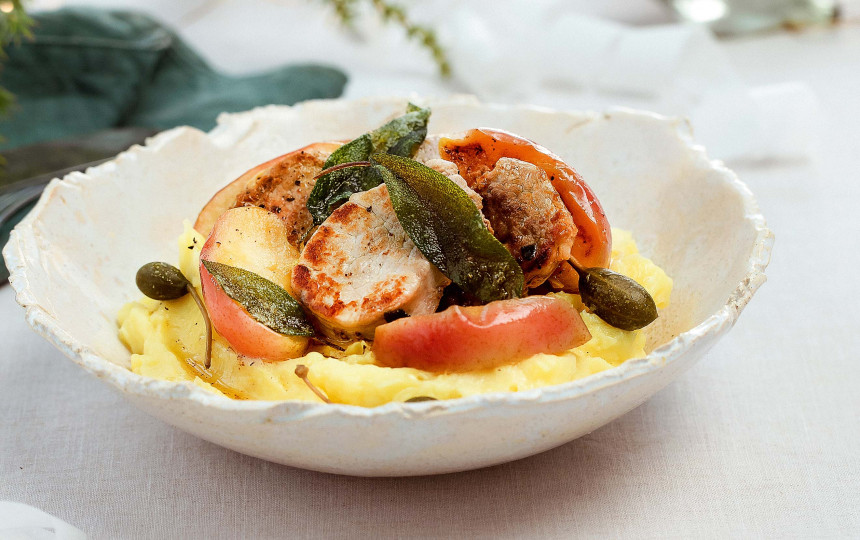 Kiaulienos išpjova su bulvių koše ir keptais obuoliais